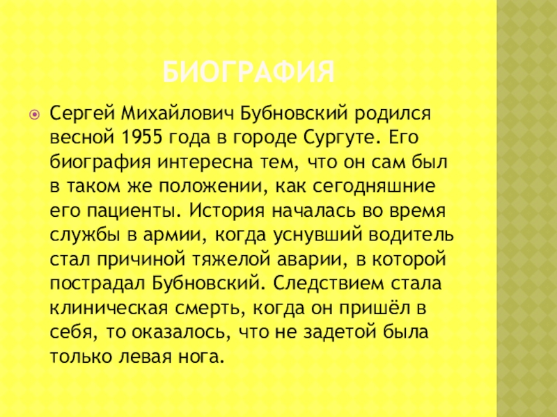 биографияВ 27 лет, не смотря на тяжёлые травмы, Бубновский решил овладеть профессией врача. Обучение проходило в 2