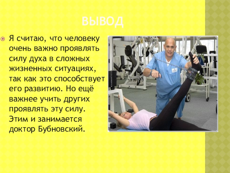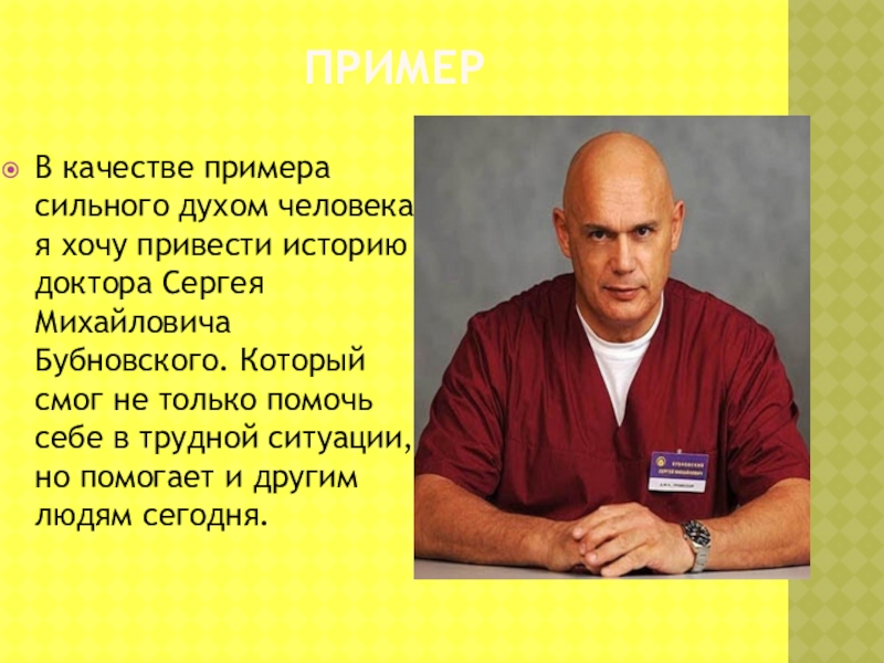примерВ качестве примера сильного духом человека, я хочу привести историю доктора Сергея Михайловича Бубновского. Который смог не