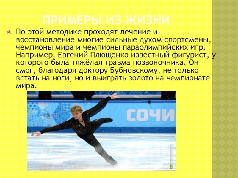 духом спортсмены, чемпионы мира и чемпионы параолимпийских игр. Например, Евгений Плющенко известный фигурист, у которого была тяжёлая травма позвоночника. Он смог, благодаря доктору Бубновскому, не только встать на ноги, но и выиграть золото на чемпионате мира.