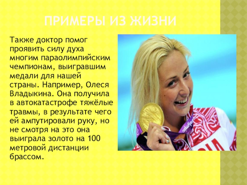 Примеры из жизни  Также доктор помог проявить силу духа многим параолимпийским чемпионам, выигравшим медали для нашей