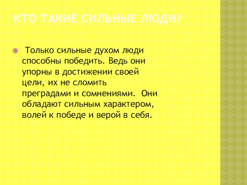 Кто такие сильные люди?  Только сильные духом люди способны победить. Ведь они упорны в достижении своей цели,