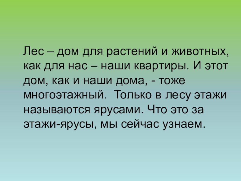 нас – наши квартиры. И этот дом, как и наши дома, - тоже многоэтажный. Только в лесу этажи называются ярусами. Что это за этажи-ярусы, мы сейчас узнаем.
