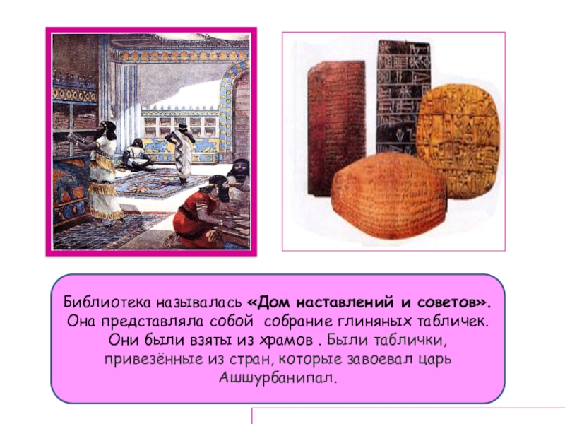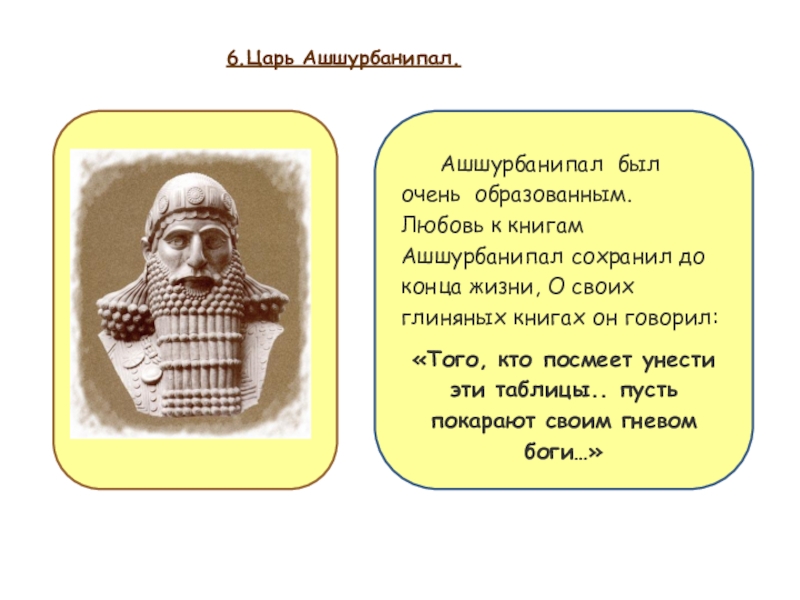 В то время с 669 по 633 годы до нашей эры в Ассирии правил царь Ашшурбанипал. Во время правления Ашшурбанипала «вся земля была мирным домом», войн почти не было.