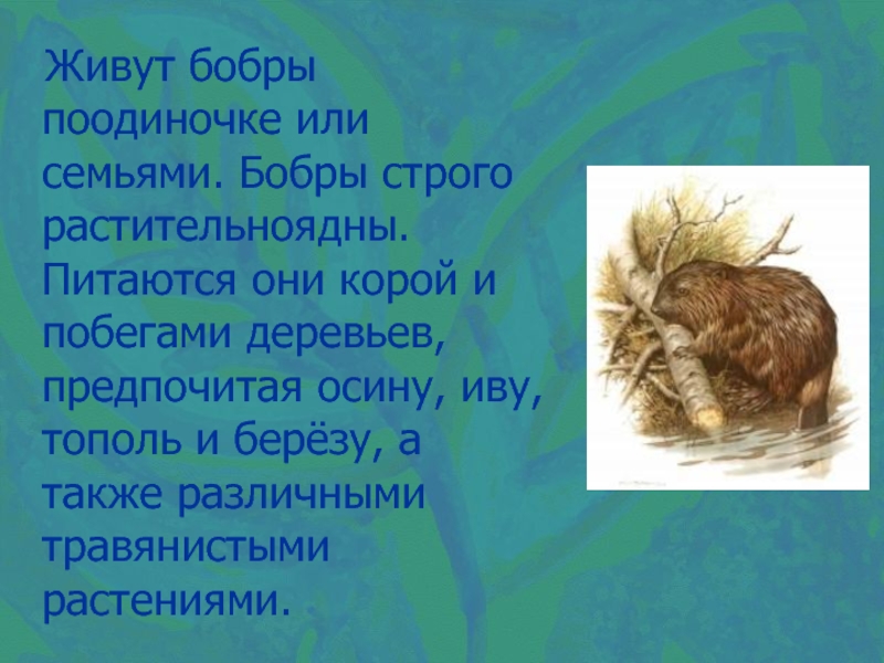 Живут бобры поодиночке или семьями. Бобры строго растительноядны. Питаются