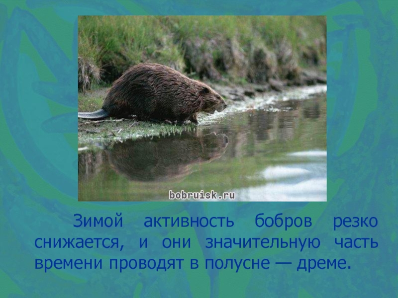 в апреле — мае. Они полузрячие, хорошо опушённые, весят в среднем 0, 5 кг. Через 1—2 суток они уже могут плавать; мать обучает бобрят, буквально выталкивая их в подводный коридор. В возрасте 3—4 недель бобрята переходят на питание листьями и мягкими стеблями трав, но мать продолжает подкармливать их молоком до 3 месяцев. Подросший молодняк обычно ещё 2 года не покидает родителей.
