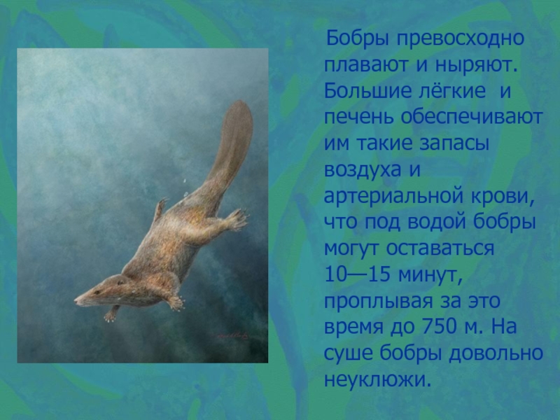 обеспечивают им такие запасы воздуха и артериальной крови, что под водой бобры могут оставаться 10—15 минут, проплывая за это время до 750 м. На суше бобры довольно неуклюжи.