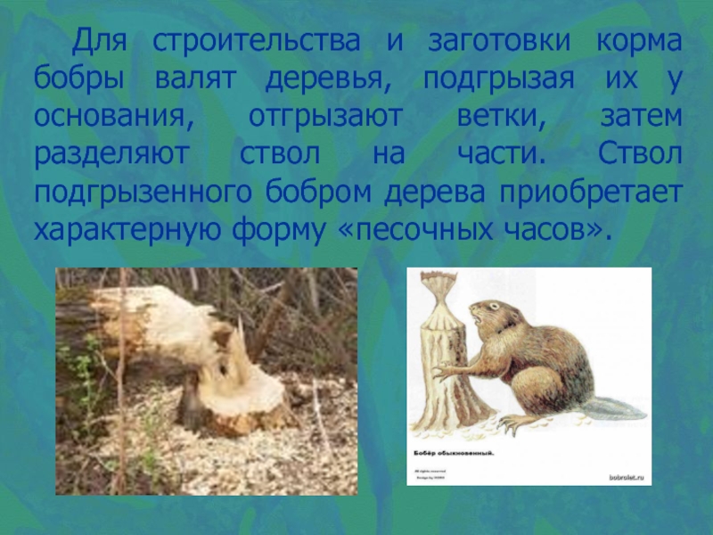 их у основания, отгрызают ветки, затем разделяют ствол на части. Ствол подгрызенного бобром дерева приобретает характерную форму «песочных часов».