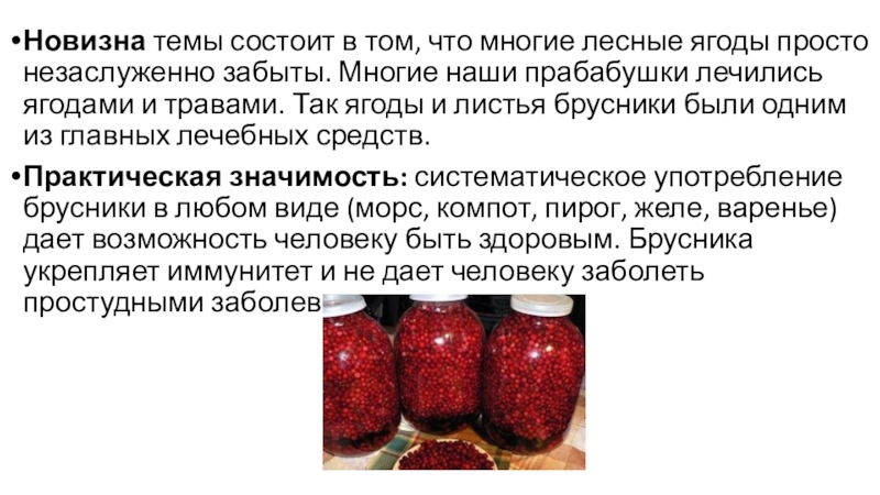 Новизна темы состоит в том, что многие лесные ягоды просто незаслуженно забыты. Многие наши прабабушки лечились ягодами