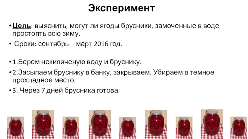 Эксперимент Цель: выяснить, могут ли ягоды брусники, замоченные в воде простоять всю зиму. Сроки: сентябрь – март