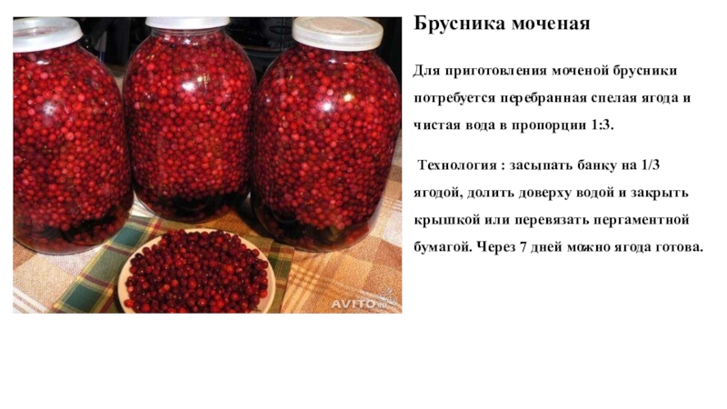 Брусника моченая Для приготовления моченой брусники потребуется перебранная спелая ягода и чистая вода в пропорции 1:3. Технология