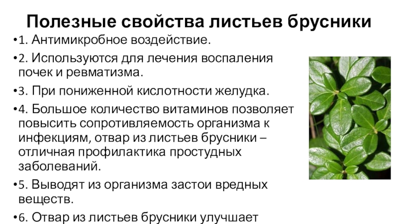Полезные свойства листьев брусники 1. Антимикробное воздействие.2. Используются для лечения воспаления почек и ревматизма.3. При пониженной кислотности