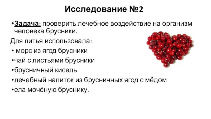 Исследование №2 Задача: проверить лечебное воздействие на организм человека брусники.Для питья использовала: морс из ягод брусники чай с