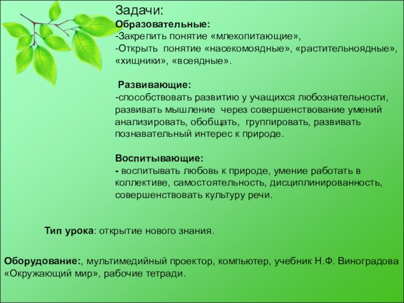 Оборудование:, мультимедийный проектор, компьютер, учебник Н.Ф. Виноградова «Окружающий мир», рабочие тетради.