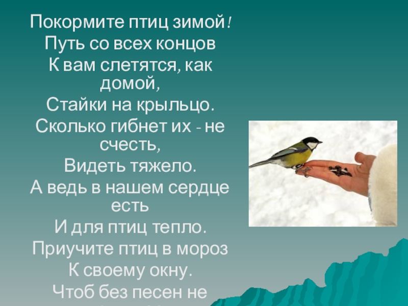 Покормите птиц зимой!Путь со всех концовК вам слетятся, как домой,Стайки на крыльцо. Сколько гибнет их - не счесть,Видеть
