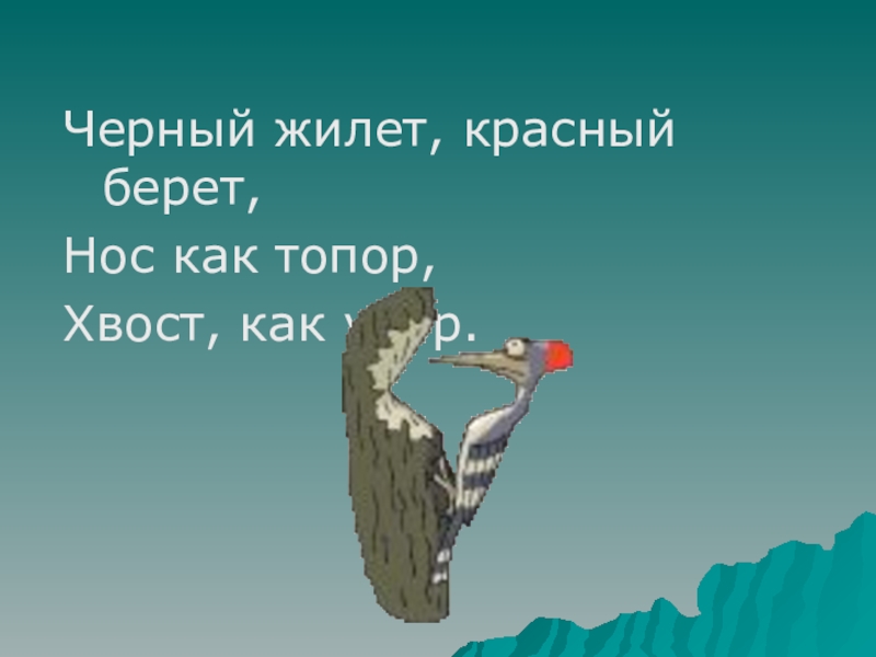 Черный жилет, красный берет,Нос как топор, Хвост, как упор.