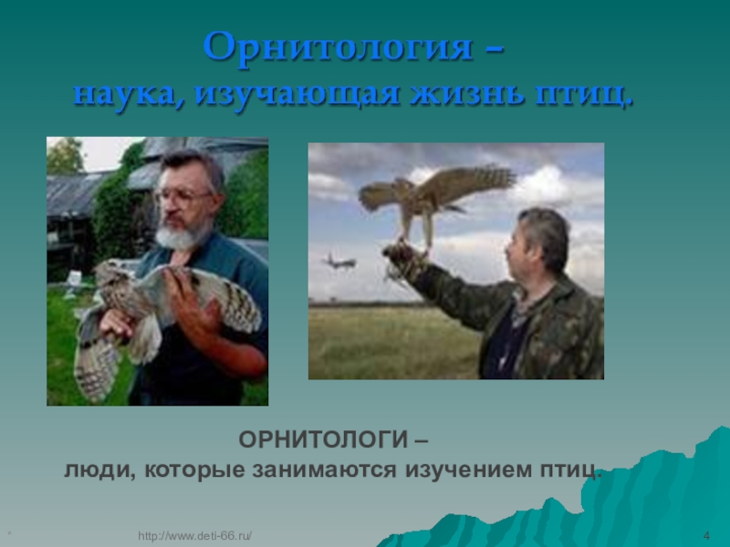 *http://www.deti-66.ru/ОРНИТОЛОГИ – люди, которые занимаются изучением птиц.