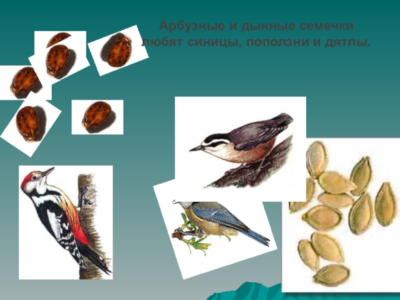 Слайд 20Арбузные и дынные семечки любят синицы, поползни и дятлы.