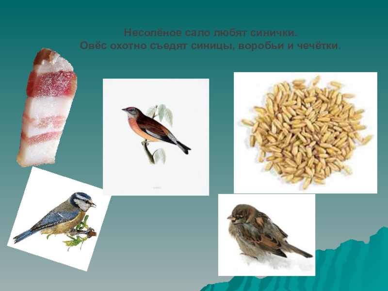 Несолёное сало любят синички. Овёс охотно съедят синицы, воробьи и чечётки.