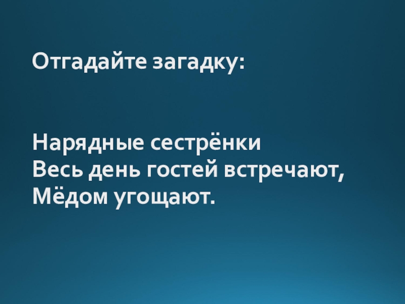 Слайд 2 Отгадайте загадку: Нарядные сестрёнки Весь день гостей встречают, Мёдом угощают.