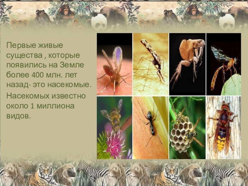 Первые живые существа , которые появились на Земле более 400 млн. лет назад- это насекомые. Насекомых известно