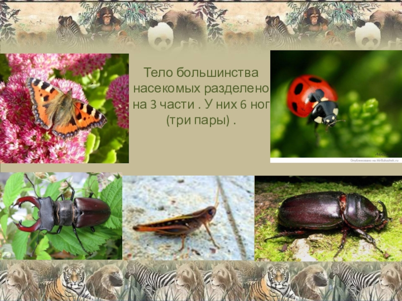 Тело большинства насекомых разделено  на 3 части . У них 6 ног (три пары) .
