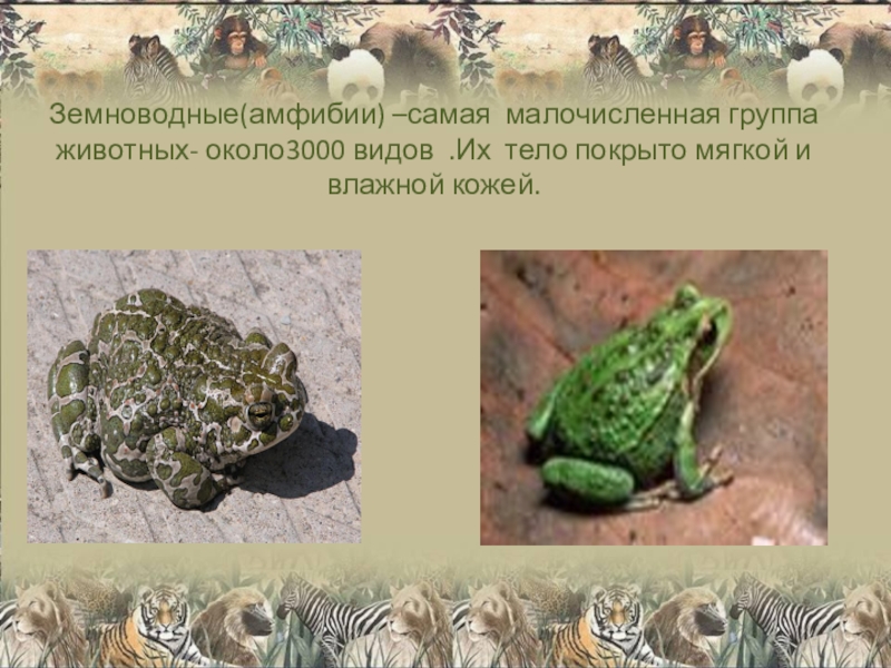 Слайд 13Земноводные(амфибии) –самая малочисленная группа животных- около3000 видов .Их тело покрыто мягкой