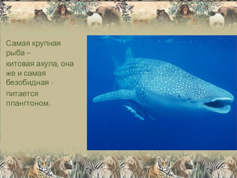 Самая крупная рыба –китовая акула, она же и самая безобидная - питается плангтоном.