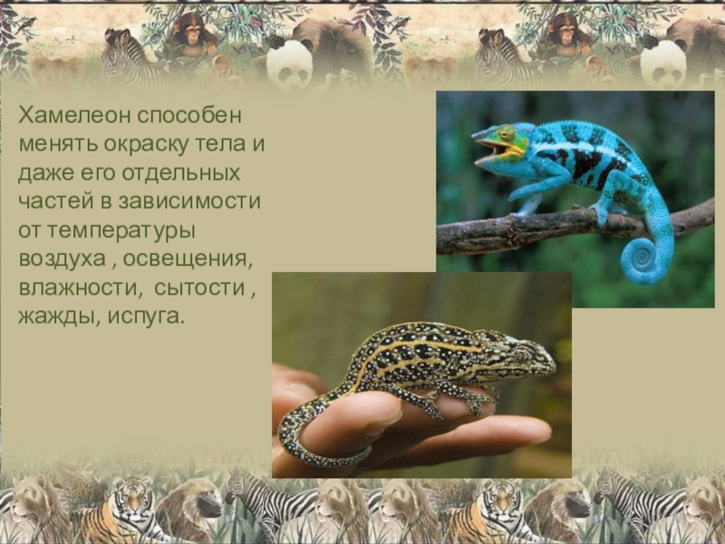 Хамелеон способен менять окраску тела и даже его отдельных частей в зависимости от температуры воздуха , освещения,