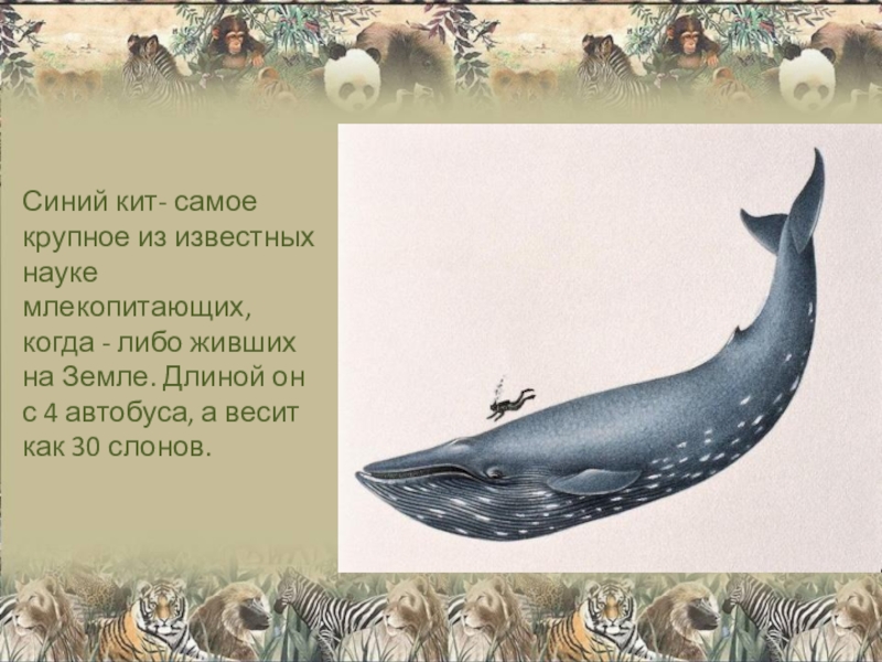Синий кит- самое крупное из известных науке млекопитающих, когда - либо живших на Земле. Длиной он с