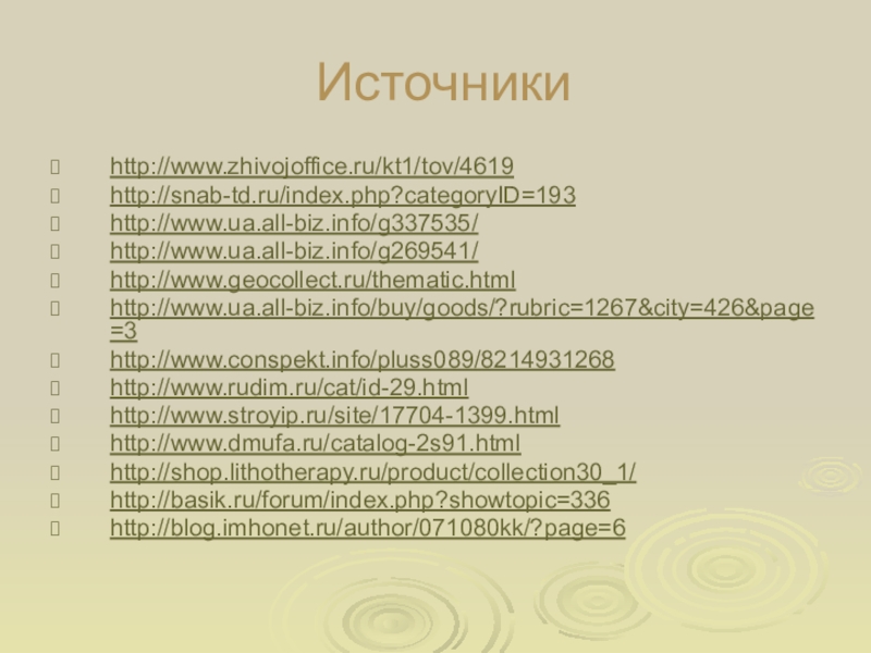 Источникиhttp://www.zhivojoffice.ru/kt1/tov/4619http://snab-td.ru/index.php?categoryID=193http://www.ua.all-biz.info/g337535/http://www.ua.all-biz.info/g269541/http://www.geocollect.ru/thematic.htmlhttp://www.ua.all-biz.info/buy/goods/?rubric=1267&city=426&page=3http://www.conspekt.info/pluss089/8214931268http://www.rudim.ru/cat/id-29.htmlhttp://www.stroyip.ru/site/17704-1399.htmlhttp://www.dmufa.ru/catalog-2s91.htmlhttp://shop.lithotherapy.ru/product/collection30_1/http://basik.ru/forum/index.php?showtopic=336http://blog.imhonet.ru/author/071080kk/?page=6