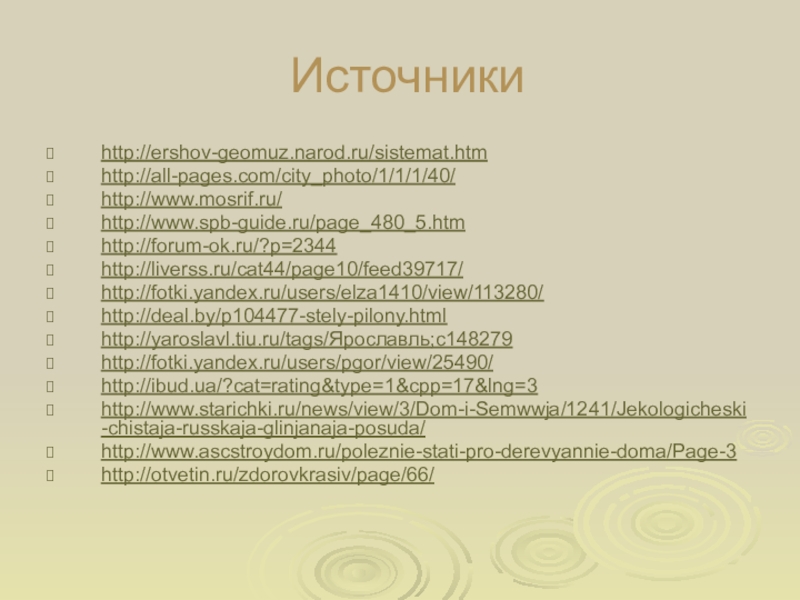 Источникиhttp://ershov-geomuz.narod.ru/sistemat.htmhttp://all-pages.com/city_photo/1/1/1/40/http://www.mosrif.ru/http://www.spb-guide.ru/page_480_5.htmhttp://forum-ok.ru/?p=2344http://liverss.ru/cat44/page10/feed39717/http://fotki.yandex.ru/users/elza1410/view/113280/http://deal.by/p104477-stely-pilony.htmlhttp://yaroslavl.tiu.ru/tags/Ярославль;c148279http://fotki.yandex.ru/users/pgor/view/25490/http://ibud.ua/?cat=rating&type=1&cpp=17&lng=3http://www.starichki.ru/news/view/3/Dom-i-Semwwja/1241/Jekologicheski-chistaja-russkaja-glinjanaja-posuda/http://www.ascstroydom.ru/poleznie-stati-pro-derevyannie-doma/Page-3http://otvetin.ru/zdorovkrasiv/page/66/