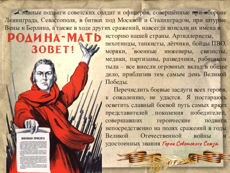 Перечислить боевые заслуги всех героев, к сожалению, не удастся. Я постараюсь осветить славный боевой путь самых ярких представителей поколения победителей, совершавших героические подвиги непосредственно на полях сражений в годы Великой Отечественной войны и удостоенных звания Герои Советского Союза.