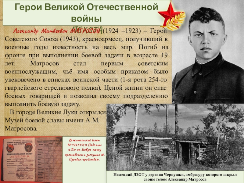 Александр Матвеевич МАТРОСОВ (1924 –1923) – Герой Советского Союза (1943), красноармеец, получивший в военные годы известность на весь мир. Погиб на фронте при выполнении боевой задачи в возрасте 19 лет. Матросов стал первым советским военнослужащим, чьё имя особым приказом было увековечено в списках воинской части (1-я рота 254-го гвардейского стрелкового полка). Ценой жизни он спас боевых товарищей и позволил своему подразделению выполнить боевую задачу.