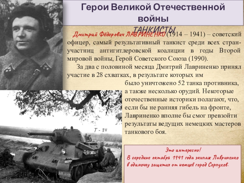 В середине октября 1941 года экипаж Лавриненко в одиночку защитил от немцев город Серпухов.