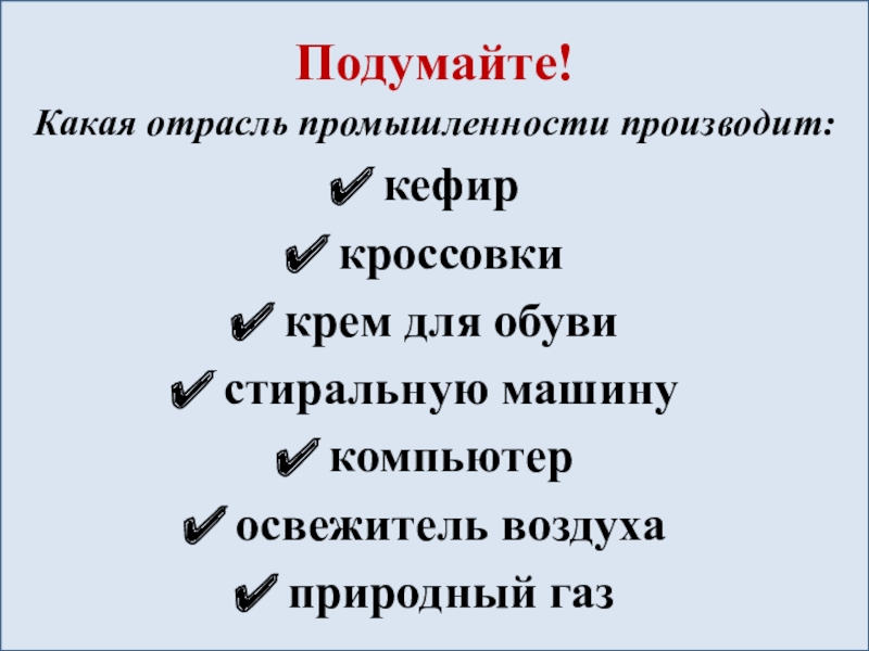 Подумайте!Какая отрасль промышленности производит:кефиркроссовкикрем для обувистиральную машинукомпьютеросвежитель воздухаприродный газ