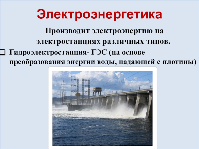 Электроэнергетика	Производит электроэнергию на электростанциях различных типов.Гидроэлектростанция- ГЭС (на основе преобразования энергии воды, падающей с плотины)