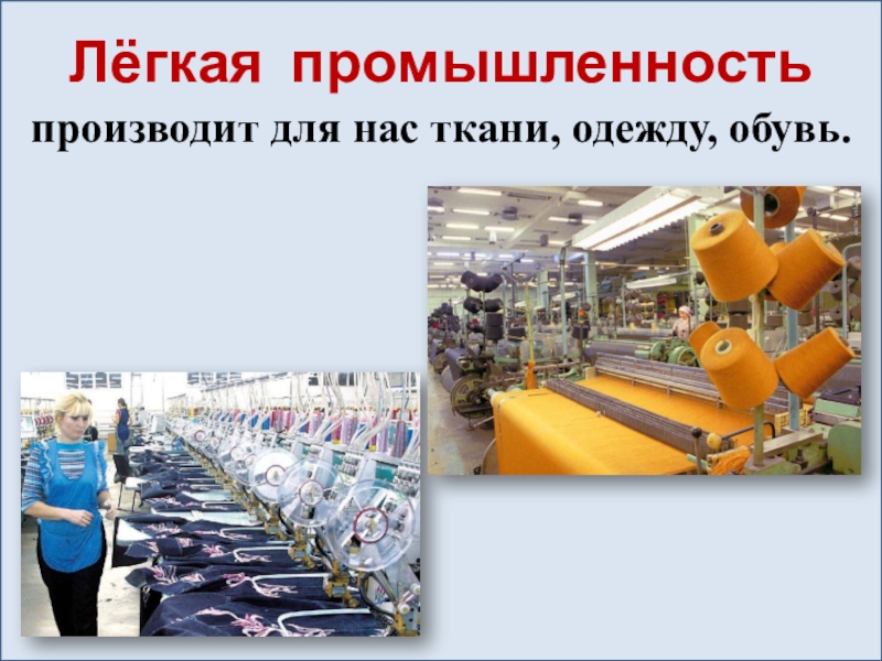 Лёгкая промышленностьпроизводит для нас ткани, одежду, обувь.