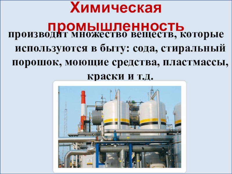 Химическая промышленностьпроизводит множество веществ, которые используются в быту: сода, стиральный порошок, моющие средства, пластмассы, краски и т.д.