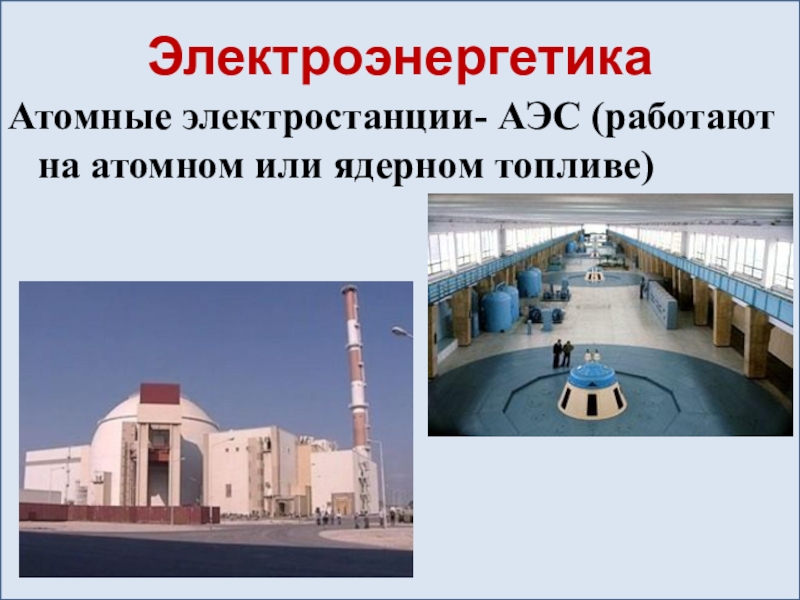 ЭлектроэнергетикаАтомные электростанции- АЭС (работают на атомном или ядерном топливе)