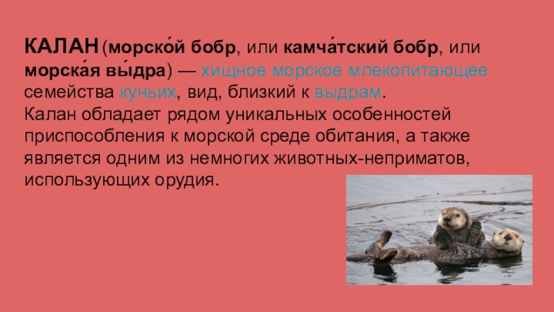 Слайд 22КАЛАН (морско́й бобр, или камча́тский бобр, или морска́я вы́дра) — хищное