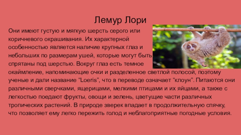 окаймление, напоминающие очки и разделенное светлой полосой, поэтому ученые и дали название “Loeris”, что в переводе означает “клоун”. Питаются они различными сверчками, ящерицами, мелкими птицами и их яйцами, а также с легкостью поедают фрукты, овощи и зелень, цветущие части различных тропических растений. В природе зверек впадает в продолжительную спячку, что позволяет ему легко пережить голод и неблагоприятные погодные условия.