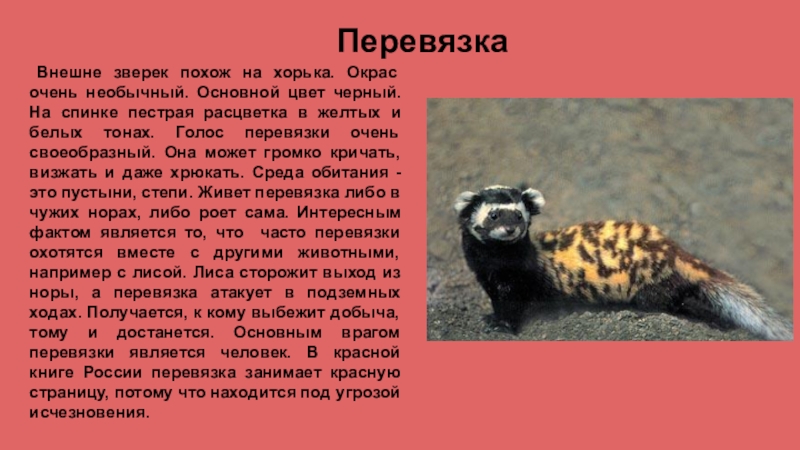 хорька. Окрас очень необычный. Основной цвет черный. На спинке пестрая расцветка в желтых и белых тонах. Голос перевязки очень своеобразный. Она может громко кричать, визжать и даже хрюкать. Среда обитания - это пустыни, степи. Живет перевязка либо в чужих норах, либо роет сама. Интересным фактом является то, что часто перевязки охотятся вместе с другими животными, например с лисой. Лиса сторожит выход из норы, а перевязка атакует в подземных ходах. Получается, к кому выбежит добыча, тому и достанется. Основным врагом перевязки является человек. В красной книге России перевязка занимает красную страницу, потому что находится под угрозой исчезновения.