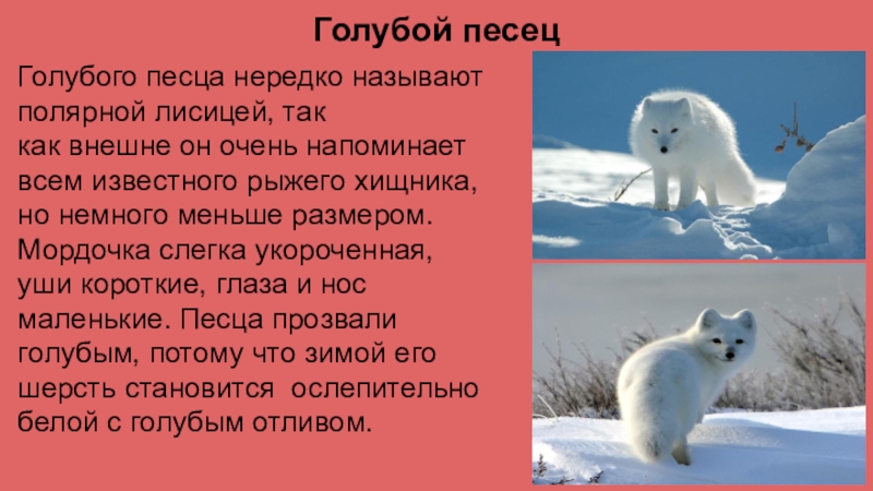 очень напоминает всем известного рыжего хищника, но немного меньше размером. Мордочка слегка укороченная, уши короткие, глаза и нос маленькие. Песца прозвали голубым, потому что зимой его шерсть становится ослепительно белой с голубым отливом.