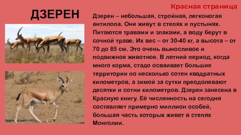 Дзерен – небольшая, стройная, легконогая антилопа. Они живут в степях и пустынях. Питаются травами и злаками, а воду берут в сочной траве. Их вес – от 30-40 кг, а высота – от 70 до 85 см. Это очень выносливое и подвижное животное. В летний период, когда много корма, стадо осваивает большие территории по несколько сотен квадратных километров, а зимой за сутки преодолевают десятки и сотни километров. Дзерен занесена в Красную книгу. Её численность на сегодня составляет примерно миллион особей, большая часть которых живет в степях Монголии.