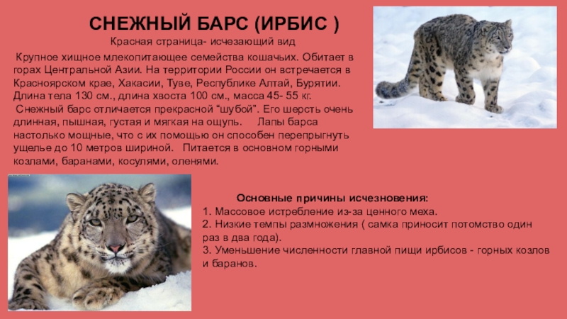Снежный барс отличается прекрасной “шубой”. Его шерсть очень длинная, пышная, густая и мягкая на ощупь. Лапы барса настолько мощные, что с их помощью он способен перепрыгнуть ущелье до 10 метров шириной. Питается в основном горными козлами, баранами, косулями, оленями.