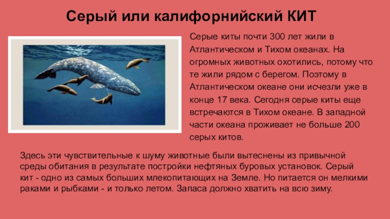 почти 300 лет жили в Атлантическом и Тихом океанах. На огромных животных охотились, потому что те жили рядом с берегом. Поэтому в Атлантическом океане они исчезли уже в конце 17 века. Сегодня серые киты еще встречаются в Тихом океане. В западной части океана проживает не больше 200 серых китов.