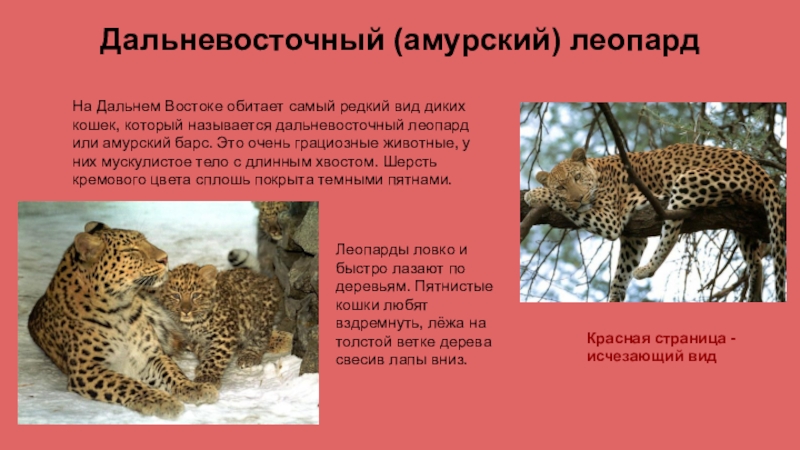 который называется дальневосточный леопард или амурский барс. Это очень грациозные животные, у них мускулистое тело с длинным хвостом. Шерсть кремового цвета сплошь покрыта темными пятнами.
