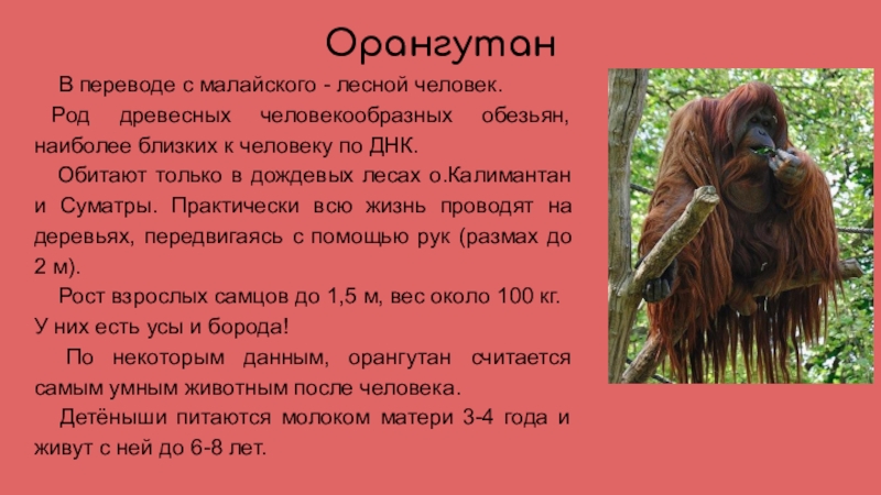 По некоторым данным, орангутан считается самым умным животным после человека.