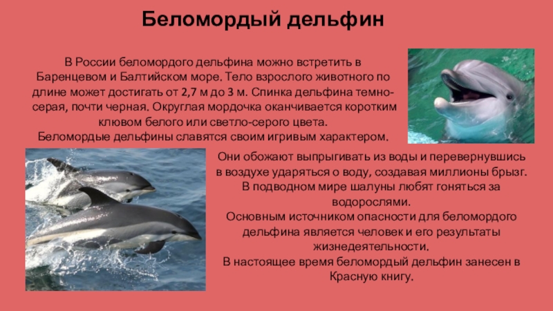 В настоящее время беломордый дельфин занесен в Красную книгу.