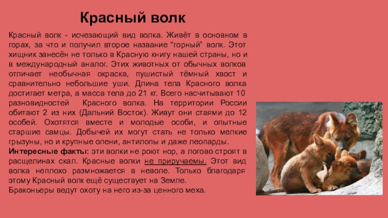 горах, за что и получил второе название “горный” волк. Этот хищник занесён не только в Красную книгу нашей страны, но и в международный аналог. Этих животных от обычных волков отличает необычная окраска, пушистый тёмный хвост и сравнительно небольшие уши. Длина тела Красного волка достигает метра, а масса тела до 21 кг. Всего насчитывают 10 разновидностей Красного волка. На территории России обитают 2 из них (Дальний Восток). Живут они стаями до 12 особей. Охотятся вместе и молодые особи, и опытные старшие самцы. Добычей их могут стать не только мелкие грызуны, но и крупные олени, антилопы и даже леопарды.